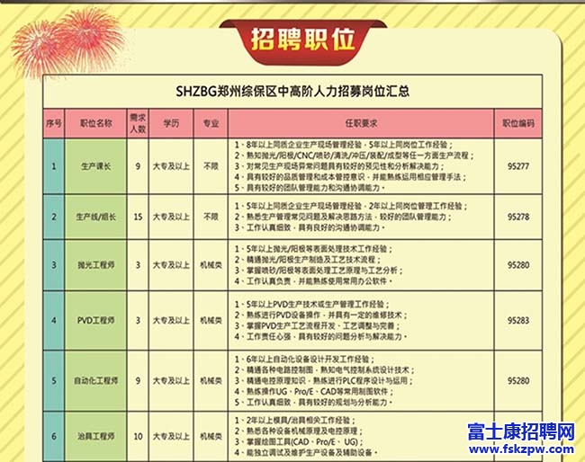 SHZBG 鄭州富士康中高階人力招募崗位匯總