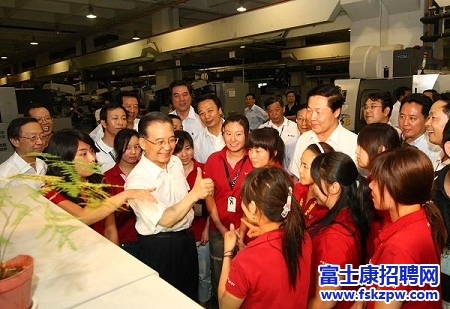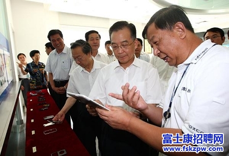 溫總理一行先后參觀了園區(qū)產(chǎn)品展示廳、太原檢測(cè)中心和太原模具總廠生產(chǎn)現(xiàn)場(chǎng)??偫砻康揭粋€(gè)地方都仔細(xì)查看,認(rèn)真詢問(wèn)公司的生產(chǎn)狀況和同仁們的工作、生活、醫(yī)療保障等情況。集團(tuán)孫玉麟特助、太原園區(qū)賀啟華協(xié)理全程陪同總理一行。孫玉麟特助向總理匯報(bào)了富士康科技集團(tuán)及太原園區(qū)的成長(zhǎng)和建設(shè)規(guī)模、就業(yè)規(guī)模﹑黨員人數(shù)﹑出口總額等情況。