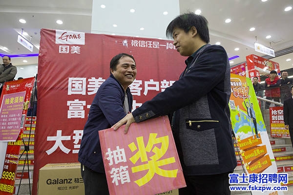購物環(huán)節(jié)結(jié)束后,國美電器安排了一場盛大的抽獎活動回饋富士康同仁的厚愛,獎品包括5g金條一根、32寸三洋液晶電視一臺、格蘭仕微波爐4臺及海爾電磁爐6臺。抽獎活動獎品豐富,趣味性高、參與性強(qiáng),極大地激發(fā)了同仁的熱情,每當(dāng)大獎送出,現(xiàn)場便爆發(fā)出熱烈的歡呼聲。