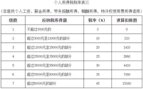 非居民個(gè)人的工資、薪金所得,以每月收入額減除費(fèi)用五千元后的余額為應(yīng)納稅所得額;勞務(wù)報(bào)酬所得、稿酬所得、特許權(quán)使用費(fèi)所得,以每次收入額為應(yīng)納稅所得額,適用個(gè)人所得稅稅率表三計(jì)算應(yīng)納稅額。勞務(wù)報(bào)酬所得、稿酬所得、特許權(quán)使用費(fèi)所得以收入減除百分之二十的費(fèi)用后的余額為收入額。其中,稿酬所得的收入額減按百分之七十計(jì)算。